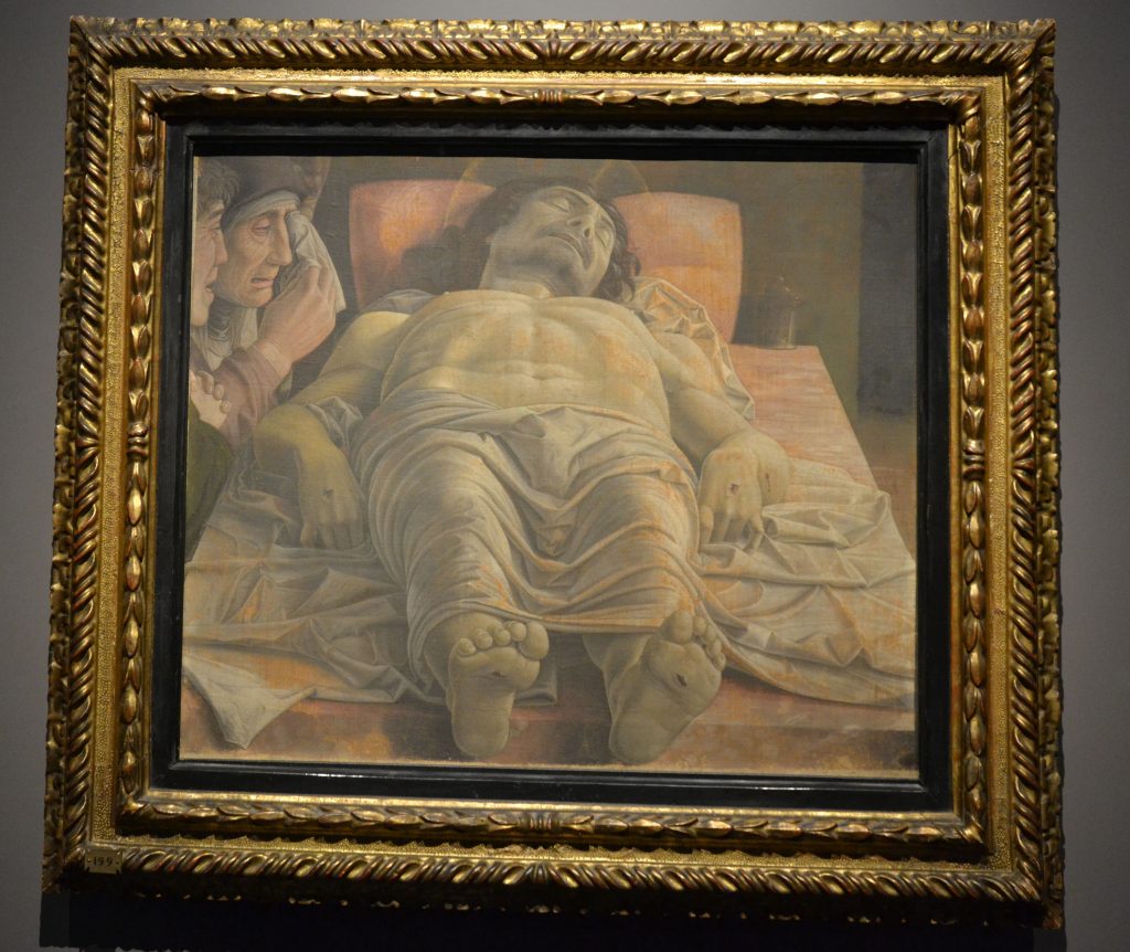 Pierwszy z nich namalował Andrea Mantegna, a dzieło nosi nazwę MARTWY CHRYSTUS. Co jest takiego niezwykłego w tym obrazie? Sceny biblijne bardzo często ocierają się o banał a tu artysta zmusza nas do zajrzenia Chrystusowi w rany. Na tym stosunkowo niewielkim obrazie Jezus jest ukazany w niesamowitej perspektywie. Widzimy Jego stopy i dłonie noszące ślady gwoździ. Klaustrofobiczne płótno wywołujące zadumę nad śmiercią Syna Człowieczego i podziwu dla kunsztu artysty.