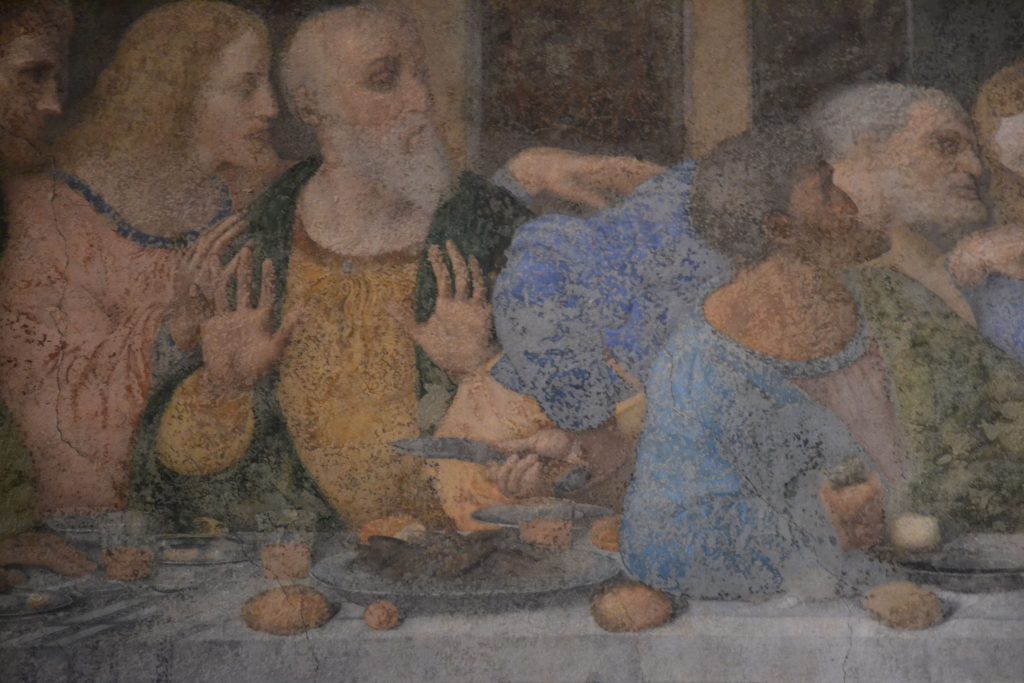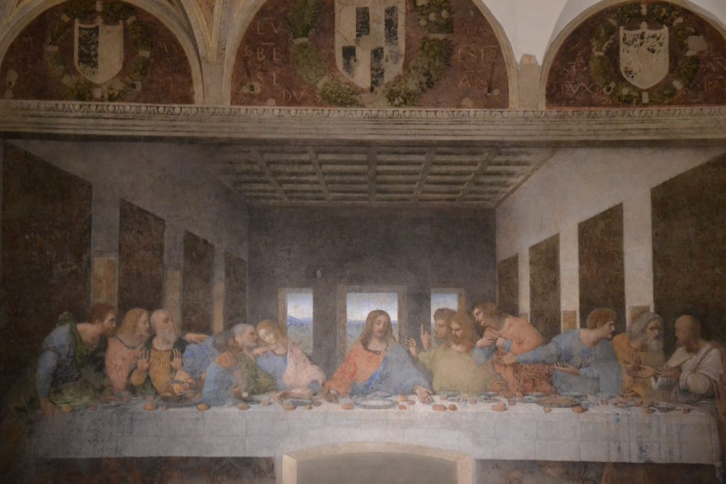 Musimy już opuścić to przepiękne muzeum bo jest tutaj w Mediolanie coś co jest ważniejsze od tej galerii. Pytacie co to takiego? Odrobina cierpliwości. Teoretycznie każdy obraz można wypożyczyć z dowolnego muzeum i obejrzeć go w wybranym miejscu. Lecz czy można wypożyczyć fresk? Fresk do którego Was zaprowadzę namalował tytan, gigant, geniusz – sam Leonardo da Vinci. Malowidło ścienne o którym mowa to „Ostatnia Wieczerza”. Trzeba je koniecznie zobaczyć bo być może jesteśmy ostatnim pokoleniem które je ogląda. Leonardo malując swój fresk posłużył się nietypową techniką, która okazała się bardzo nietrwała. Niewiele tu pomagają renowacje ale arcydzieło swoim majestatem obezwładnia chyba każdego. Stojąc przed freskiem jesteśmy … w środku wieczerzy razem z Chrystusem i jego uczniami. Efekt trójwymiaru osiągnięty pędzlem genialnego Leonarda jest nieziemski. Jest to najbardziej znany wizerunek „Ostatniej Wieczerzy” więc nie będę jej dalej opisywał wspomnę tylko o dodatkowej nie należącej do nikogo dłoni z nożem. Co wielki Mistrz chciał nam powiedzieć?